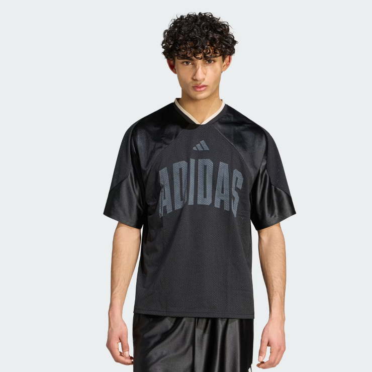 Costruita principalmente con mesh traspirante e con una vestibilità ampia, aiuta a rimanere fresco e comodo mentre rappresenti. La grafica adidas accattivante, che ricorda i nomi delle squadre sulle divise americane, completa il look imponente.